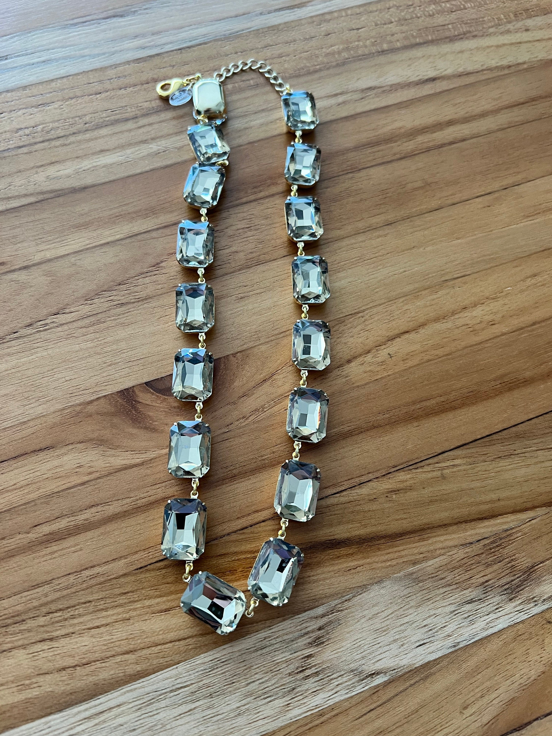 I am in love with this necklace. In the description it says "goes with everything" and that is so true. The color is like a smoky neutral. I will definitely be adding another one (or two or three) to my new collection. Great seller - on-time, beautifully packaged and super fast with responding to questions. Thank you!!! (and I got the matching earrings too!)